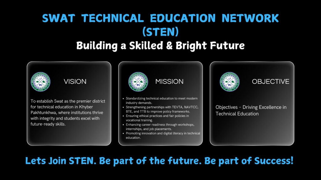 Swat Technical Education Network (STEN) is committed to making Swat the leading district for technical education. Be part of a network that promotes fair policies, innovation, and excellence in vocational training.